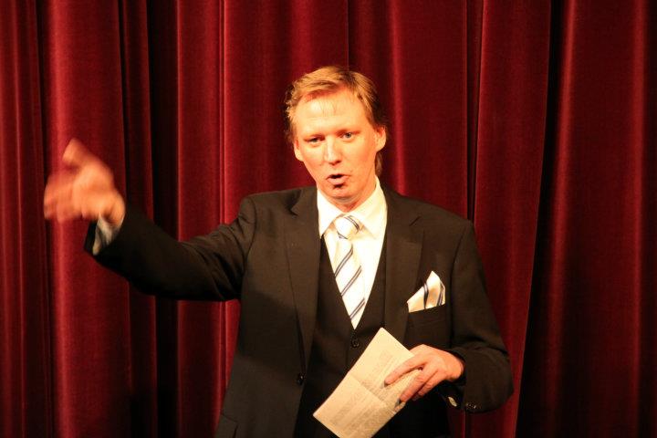 Für den Programmblock, in dem Thomas als Pater Brown auf der Bühne stand, übernahm Markus Beutner-Schirp vom Theater Freudenhaus die Moderation und hatte erhebliche Schwierigkeiten, die Buchstaben G L U P in die richtige Reihenfolge zu bringen. Da war dann ein "Mea Gulpa" fällig:
